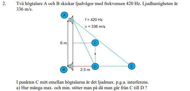 Jag har räknat ut att sträckan AD är 6,5 meter. Sen har jag räknat ut våglängden och kommit fram till att D måste vara 5:e max, och sen är ju C centralmax dvs n = 0, så då borde man väll säga att man stöter på 5 max när man är vid C och går mot D, men hur tänker man gällande min? är det så att det finns 5 min också?
