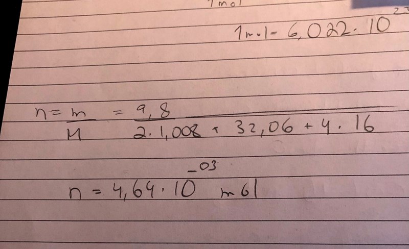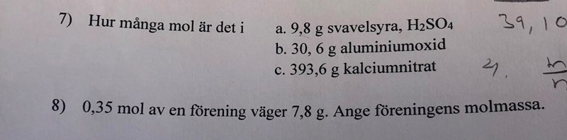 formeln för mol är n= m (massan i g)/ M (molmassan i g/mol)?