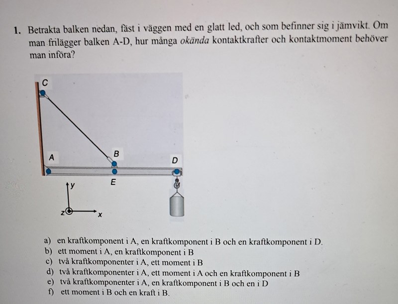 Så de enda krafterna är B , D och i A. Varför har A två kraftkomponenter? Varför ger B inget moment? Sen säger du att balkens tyngdkraft verkar I E. Hur gör den det när den hänger i D ?