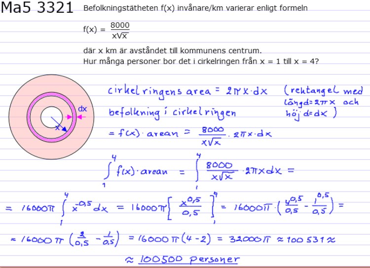 - Om vi tittar t ex på hur många personer som bor mellan 2 och 2,001 km från centrum, så är ytterkanten och innerkanten på denna cirkelring så nära lika långa att vi kan göra approximationen att arean av denna cirkelring är lika med (omkretsen på en cirkel med radien 2 km) gånger 1 meter. Om vi gör dx ännu mindre än 1 meter så stämmer det ännu bättre. Om vi gör dx oändligt litet så stämmer det exakt.