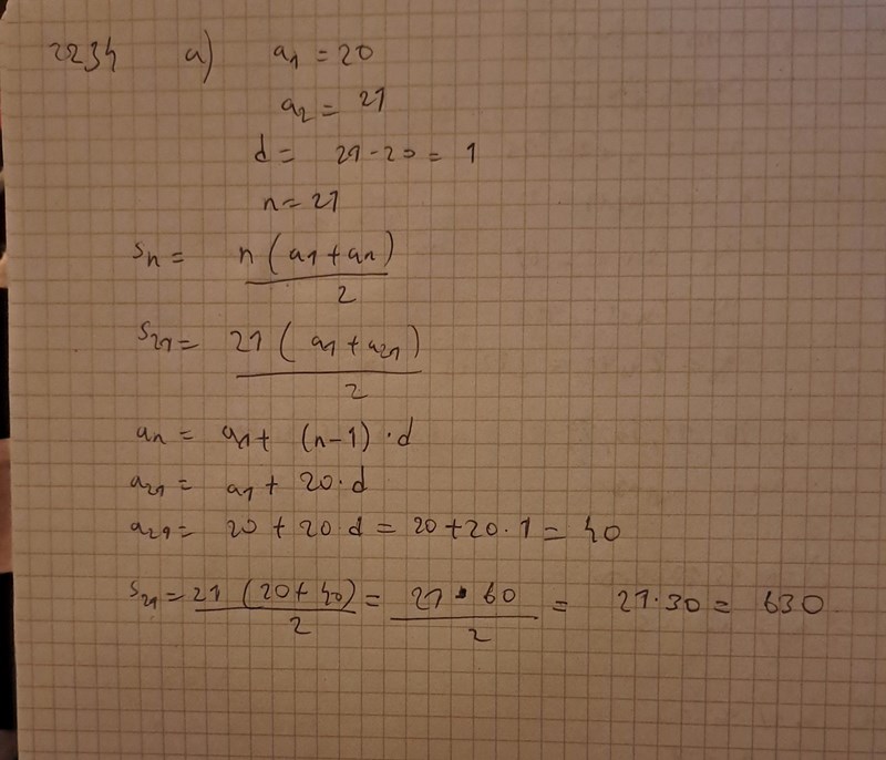Jag tänkte att antal platser är 20 st dvs rad 1 a1=20 och a2=21 och när jag räknade fick jag det till 21 st totalt. Vad gjorde jag för fel? Rätt svar är 590 st.