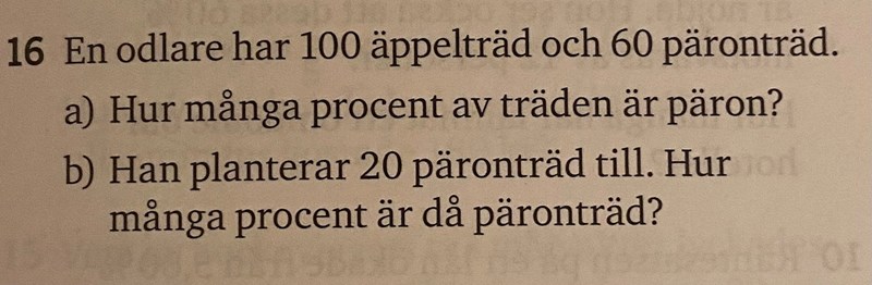 b) Ja, om inga träd har försvunnit under tiden, så har han 100 äppelträd och 60+20 = 80 päronträd.