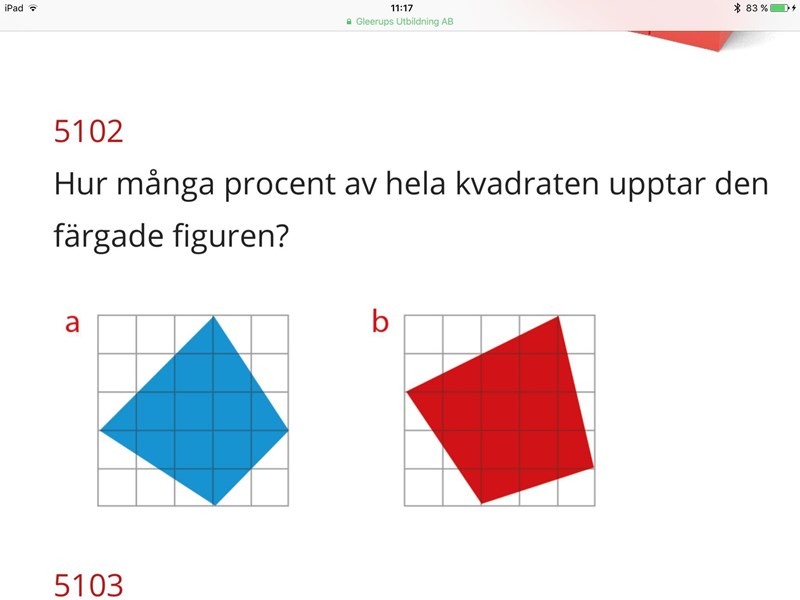 Jag räknade antal rutor i hela vita kvadraten, sedan räknade jag antalet blå kvadrater. Tillslut fick jag det till 48%, men facit säger att svaret blir 56%