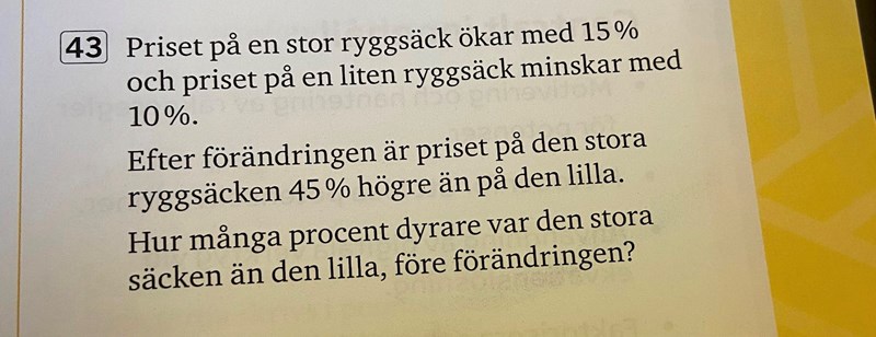 Försökte göra en ekvation och räkna ut hur mycket säckarna kostade innan förändringen men jag fastnade där och min lärare är borta till nästa vecka.
