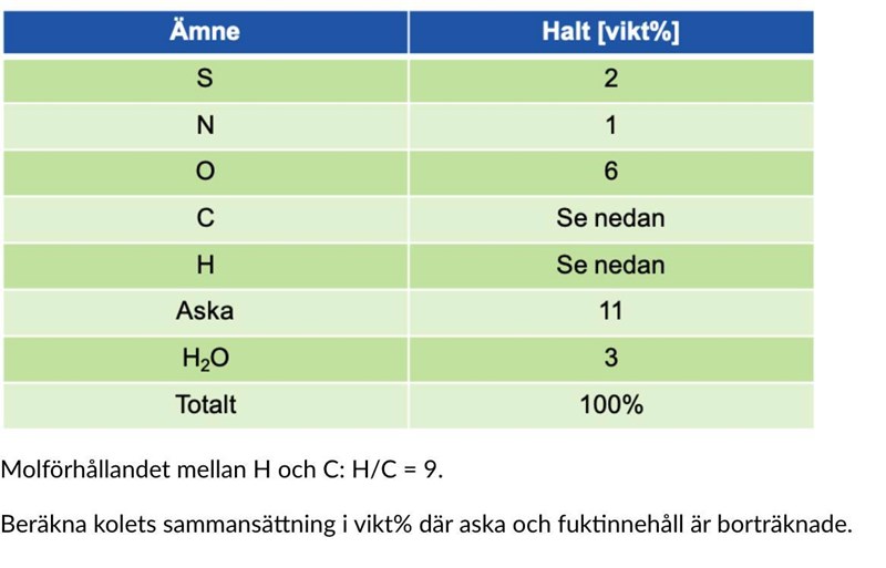 Du har börjat precis som jag skulle ha gjort och kommit fram till att 100 g kol innehåller 77 g (C + H). Problemet att det är det är molförhållandet, inte massförhållandet, mellan H och C som är 9. Detta måste du ta hänsyn till.