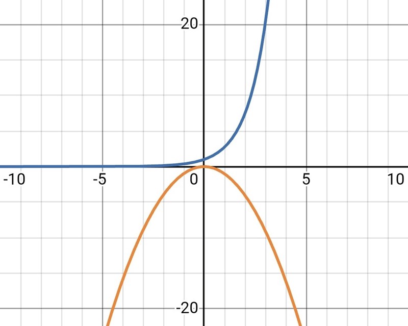 Om b är negativ är högerledet en konkav parabel med max i (0,0). Då e^x>0 för alla reella x skär de aldrig