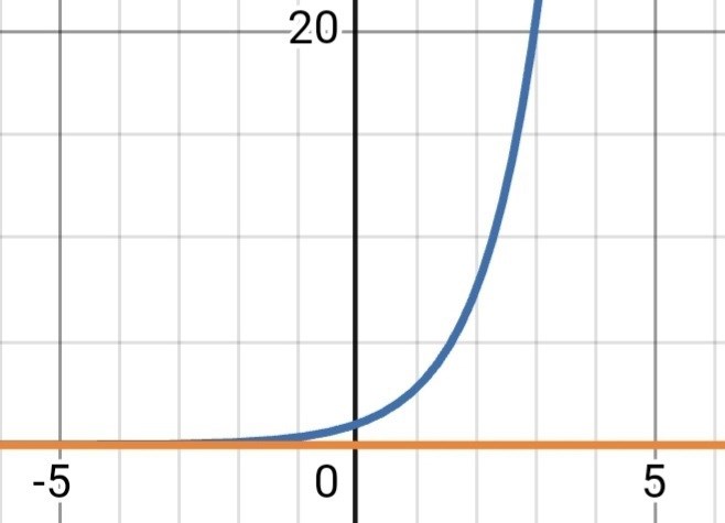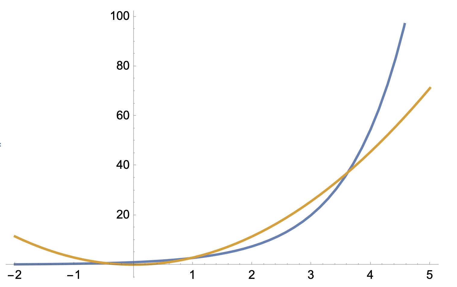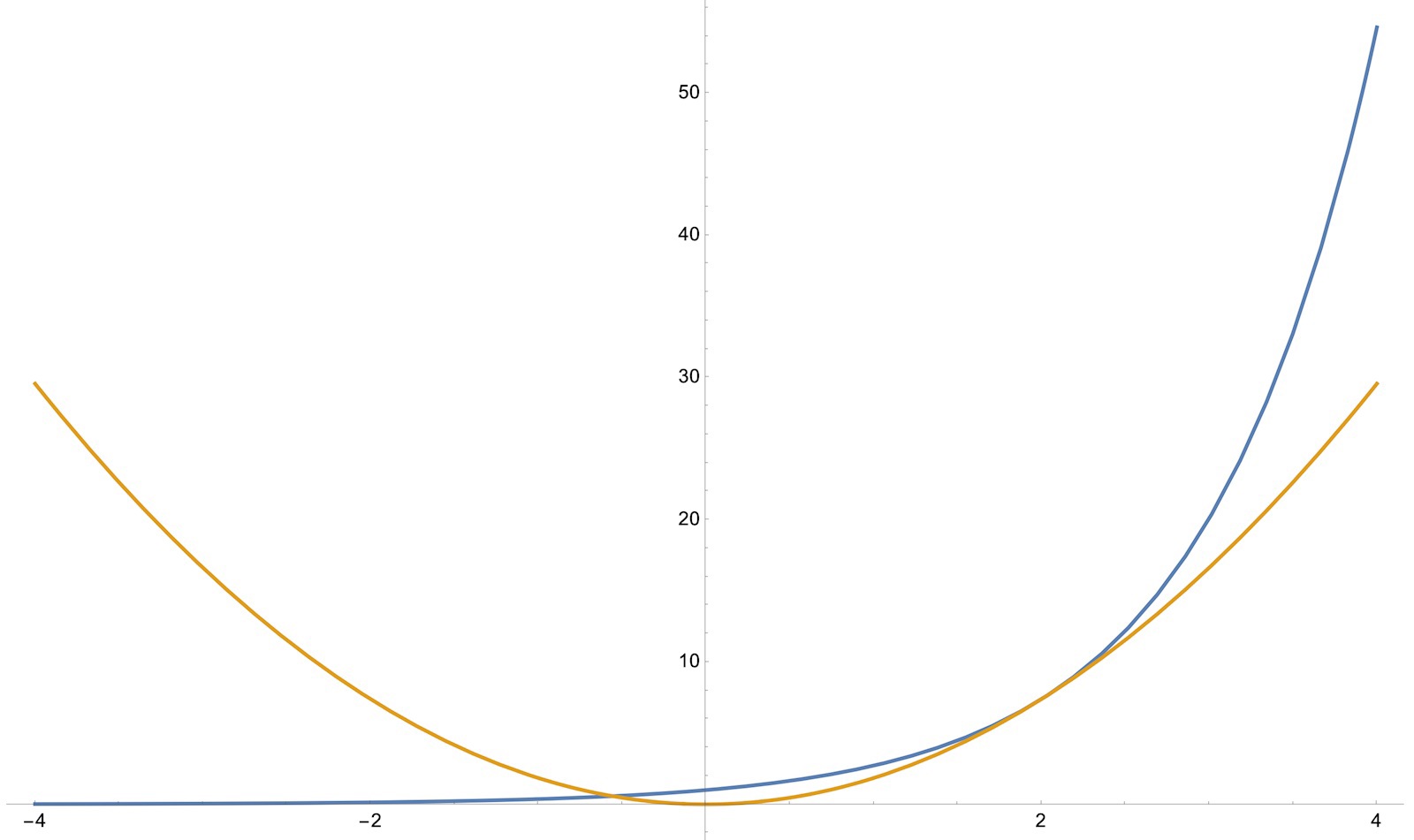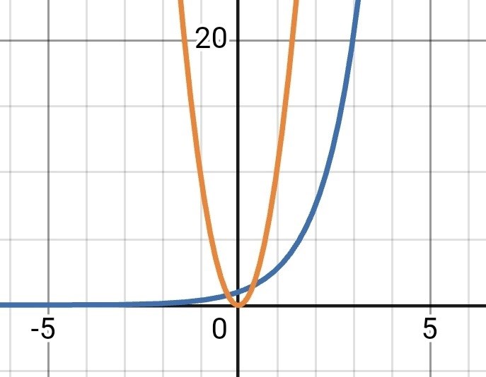 Man får bara ge e^x "tid" att komma ifatt bx^2, vilket den alltid gör, då e^x är mycket "kraftigare" i tillväxt än något polynom, bara x är tillräckligt stort. När väl e^x skär bx^2 för stora x kommer bx^2 aldrig "ikapp" igen.