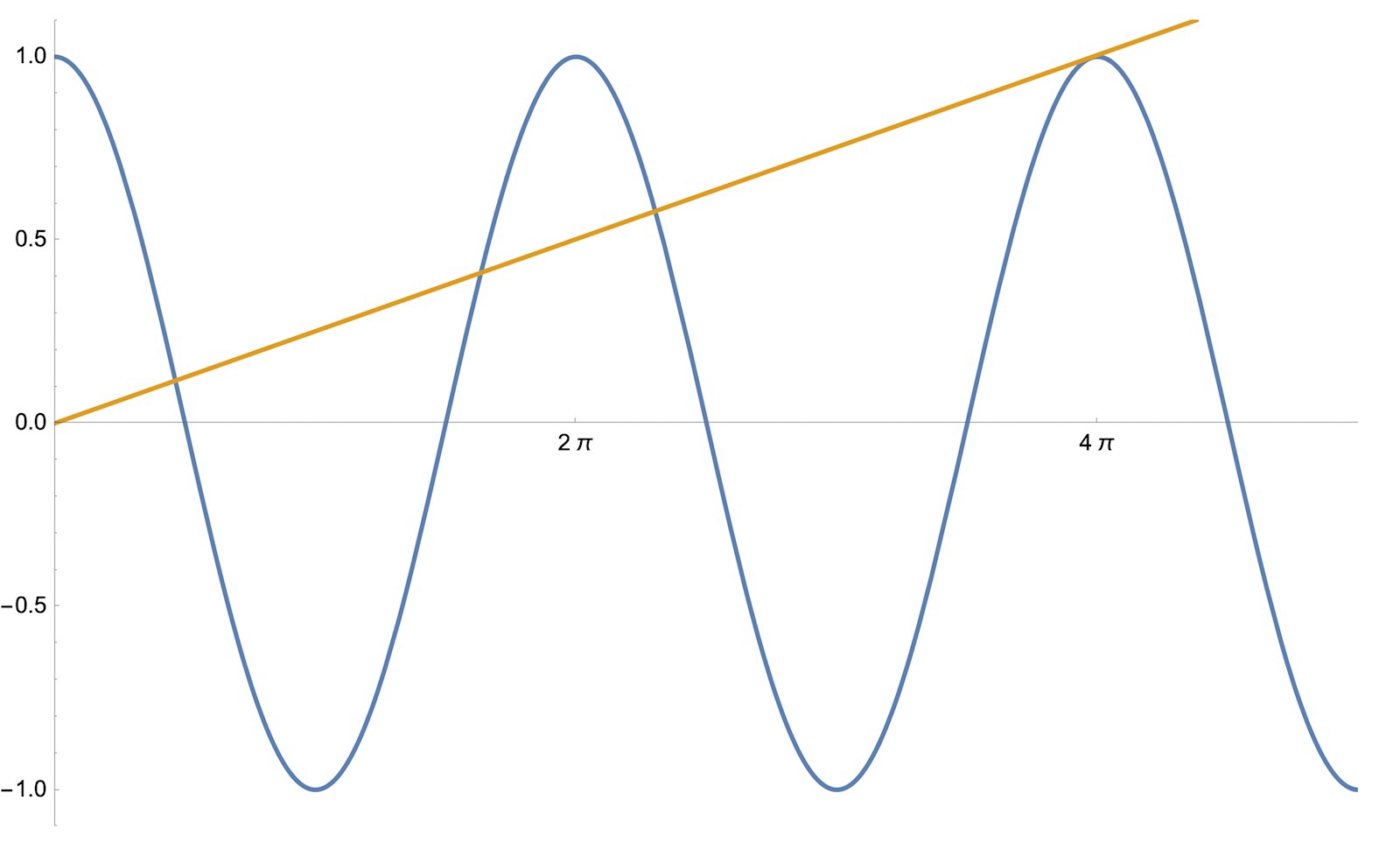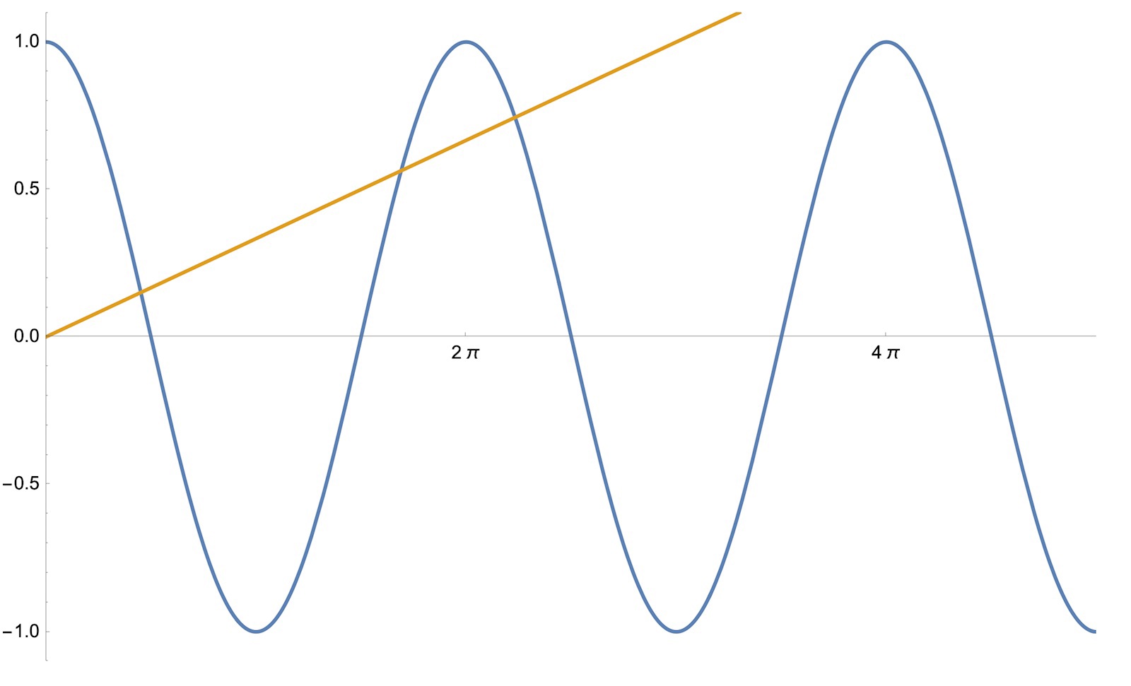 c) Man kan beräkna det n:te lokala maximipunkten x=A för cos(x) och om riktningskoefficienten c>0 är mindre än 1/A vad sker då? Börja med en närliggande maximpunkt och arbeta dig utåt och se vad som händer med antalet skärningar. Även här har vi ett tangentfall. En lite knepig uppgift.