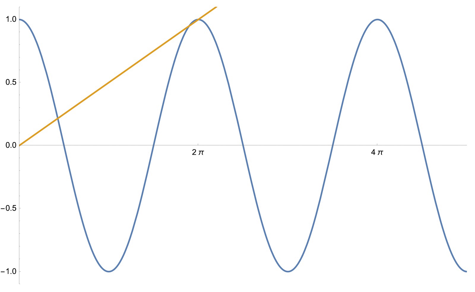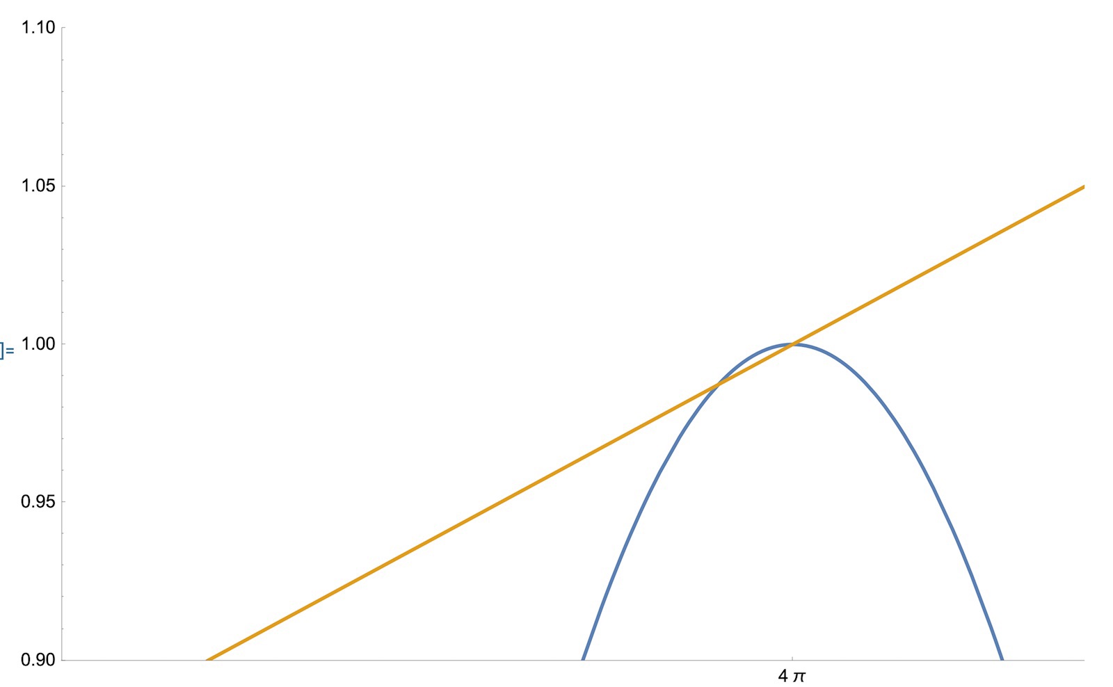 och är inte lätt att beräkna. Om vi använder NR med start på 2π fås 6.12125 vilket (självklart) ligger t.v. om maxpunkten. Efterhand som vi rör oss ill höger på x-axeln och c minskar kommer denna tangeringspunkt att 'glida' närmare maxpunkten, t.ex. vid x=20π och c=1/(20π) fås tangeringspunkten 19.9949π. De kommer aldrig sammanfalla men det blir svårt (omöjligt) att finna en sluten form för c för denna tangeringspunkt.