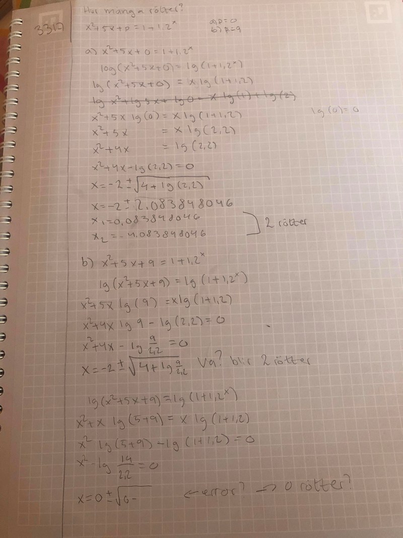 Hur många rötter har x^(2)+5x+p=1+1,2^(x) om a)p=0 och b)p=9, uppgift 3317 liber ma2c