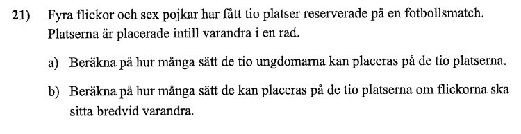 Jag har fastnat på b)-uppgiften jag förstår att flickorna kommer kunna placer ut på 4! sätt och pojkarna 6!. Men om jag tar 6!*4! blir det fel svar (rätt svar är 120 960) och jag får det till 17280?