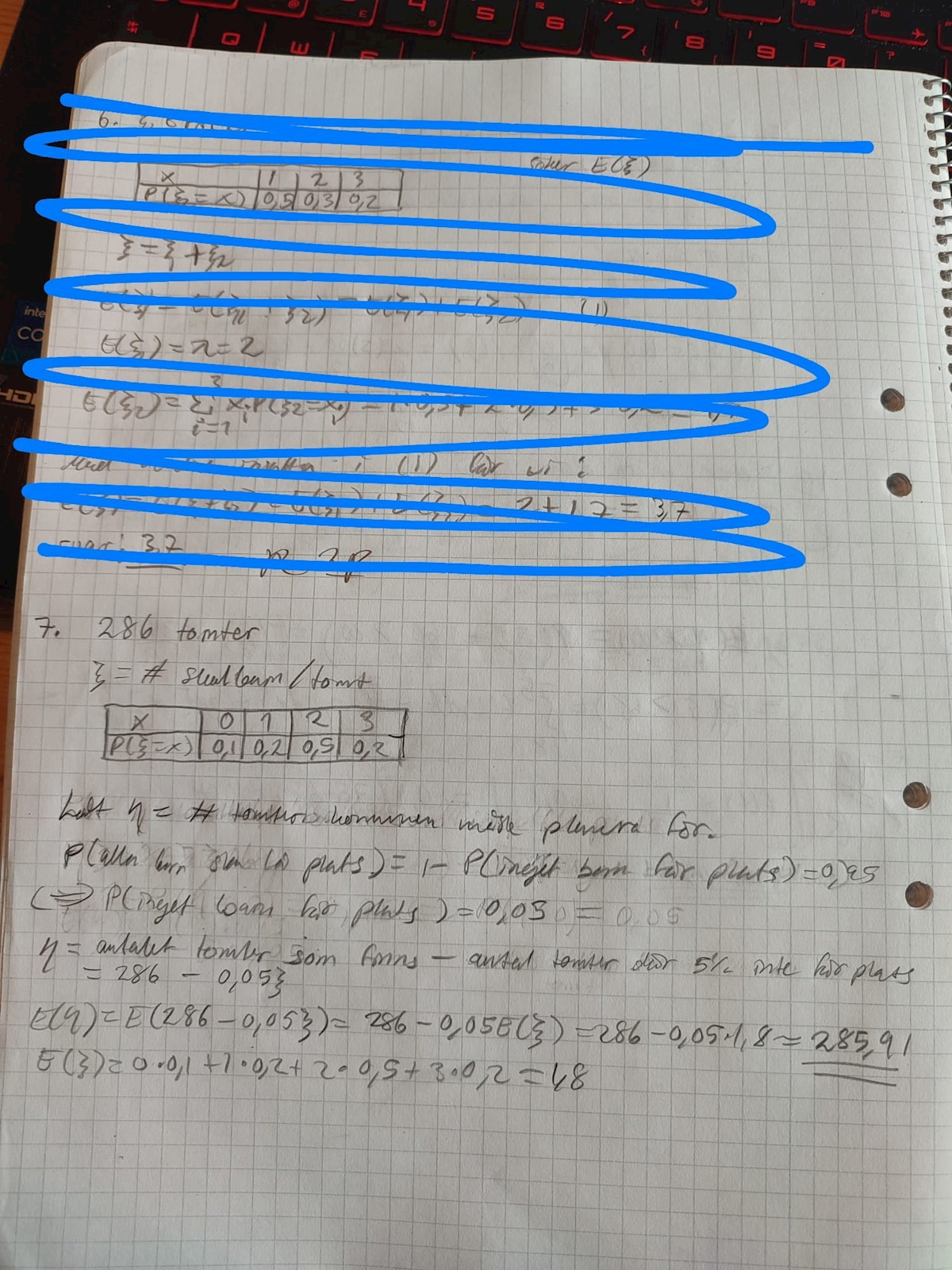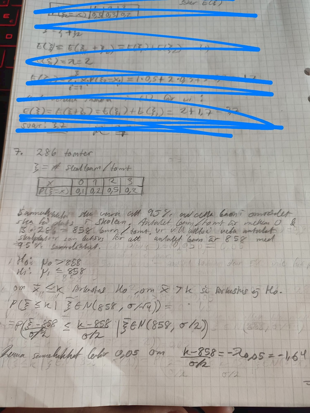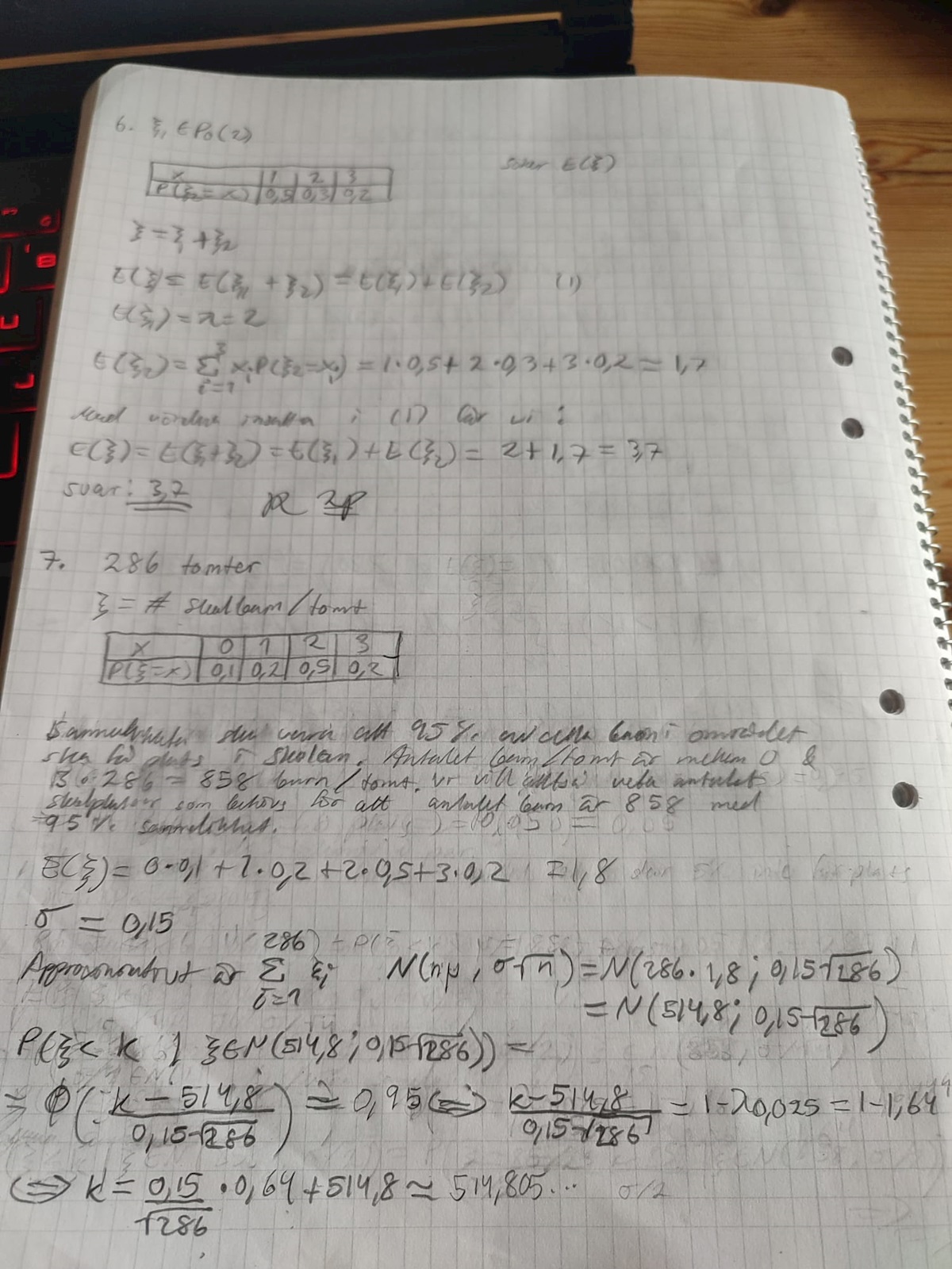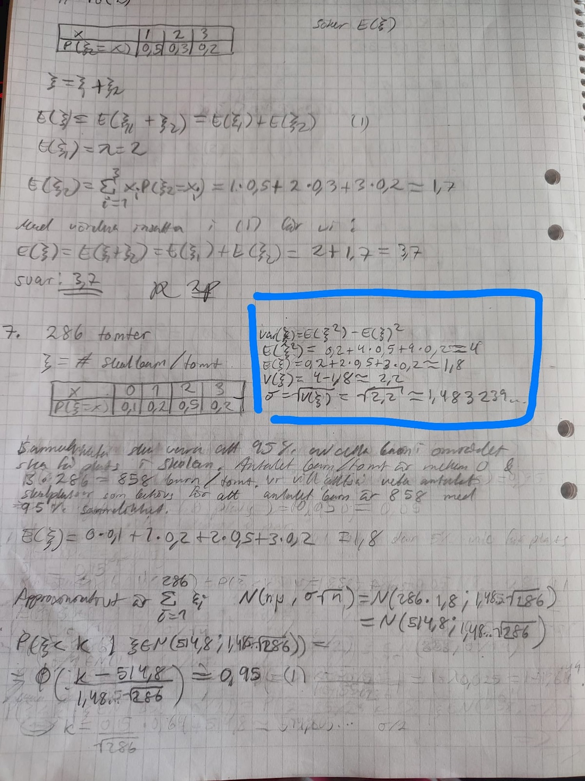 Jag tänker att E(xi) = 1,8 och sigma beräknade jag sedan med hjälp av stat-funktionen i miniräknaren så sigma = 0,15. Därefter använde jag centrala gränsvärdessatsen för att approximera alla xi till N(my*n;sigma*sqr(n)) = N(1,8*286;0,15*sqr(286) = N(514,8;0,15*sqr(286))
