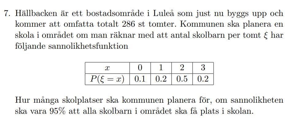Din uppgift är att bestämma antalet skolplatser sådant att antalet barn är under detta värde med 95% sannolikhet.