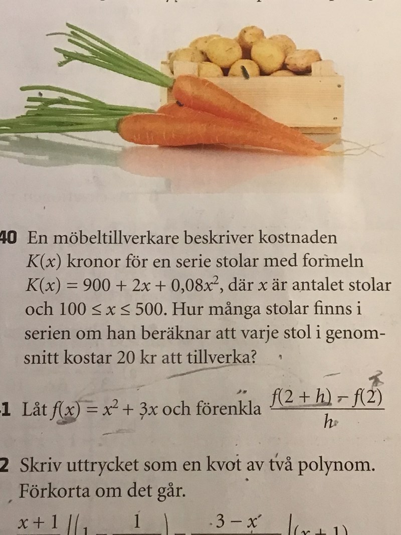 Det kostar  K(500) kr att tillverka en serie om 500 stolar, 900 + 2·500 + 0,08·5002 = 21900 kr Genomsnittskostnaden för en stol i den serien blir då 43,80 kr