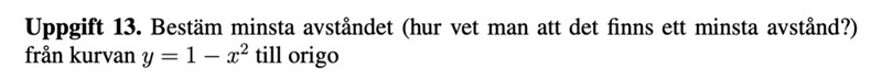 Det är väldigt uppenbart för man ritar upp kurvan att det finns ett minsta avstånd men hur ska man matematiskt bevisa det? Vi har ju inte ett slutet och begränsat intervall. Jag får att avståndet från origo till kurvan ges utav d(x)=sqrt(x^2+(1-x^2)^2). Om man tar gränsvärdet denna ekvation när x går mot ±∞ får vi ∞. Kan man använda sig utav den informationen på något sätt?