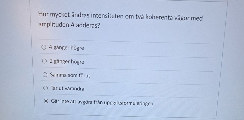 Tyvärr känner jag inte till den konstanta fasförskjutningen enligt uppgiften. Men tidigare sa du att fasförskjutningen är konstant pga koherenta vågor och då är cos(fi)=0 och då får jag 4kA^2=4I vilket gör att a) är rätt.