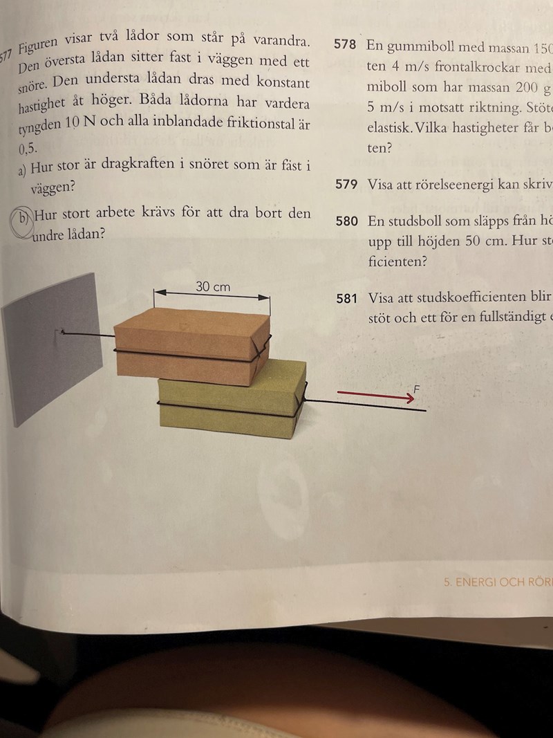 Den friktionskraften som är mellan borden och lådor beräknas med Fn för båda lådor. Då får du summering 15 N bakåt , då bör kraften framåt vara lika. W=0,3*15=4,5
