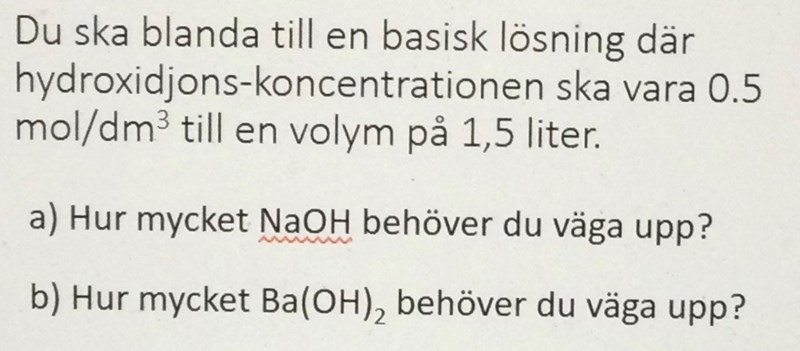 Smaragdalena skrev:Hur många mol hydroxidjoner behövs det till 1,5 liter med koncentrationen'0,5 mol/dm3?