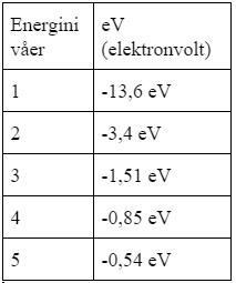 Jag har fått en fråga av min fysiklärare. Frågan lyder; Säg att elektronen för H befinner sig i energinivå 1 (K-skalet), hur mycket energi behövs då tillsättas för att få elektronen att excitera till energinivå 5 (M-skalet)?