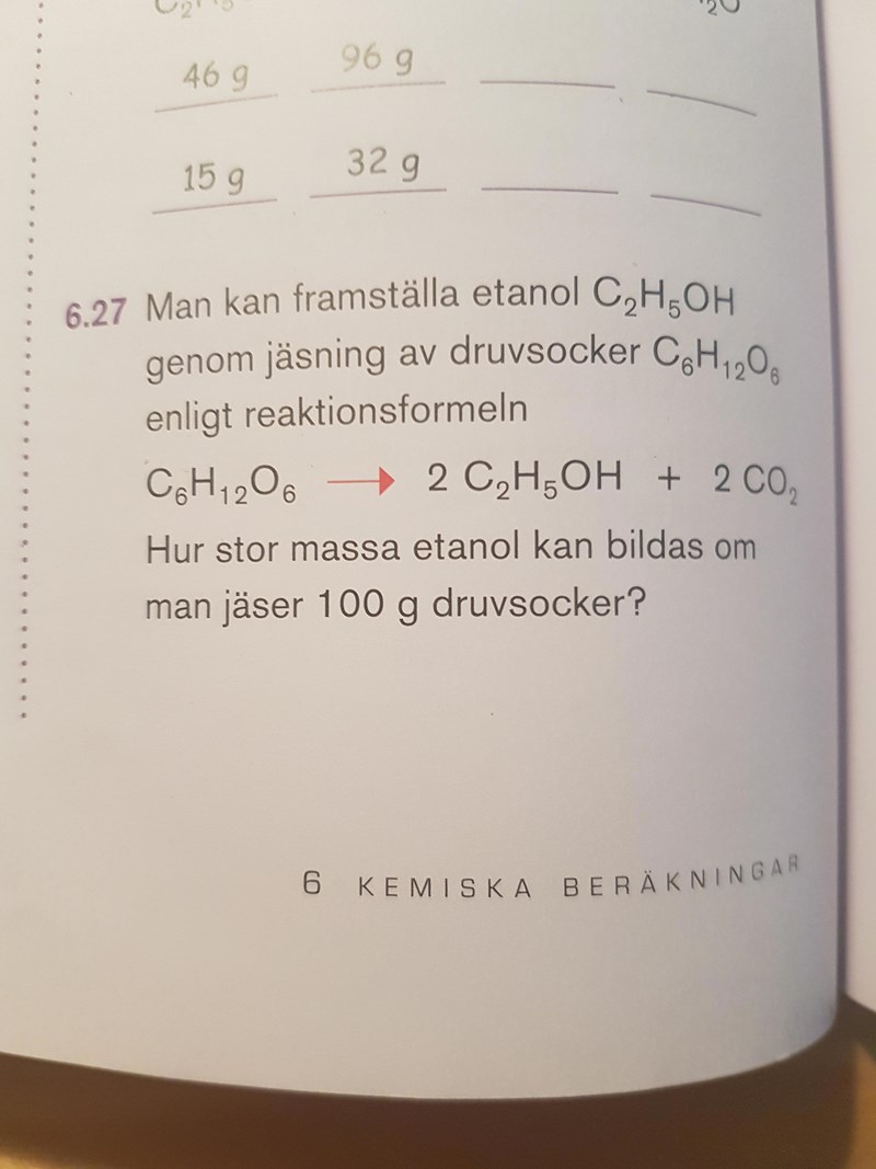 Hej. Jag löste precis en uppgift där jag skulle beräkna massan etanol som bildades vid jäsning av 100g druvsocker.