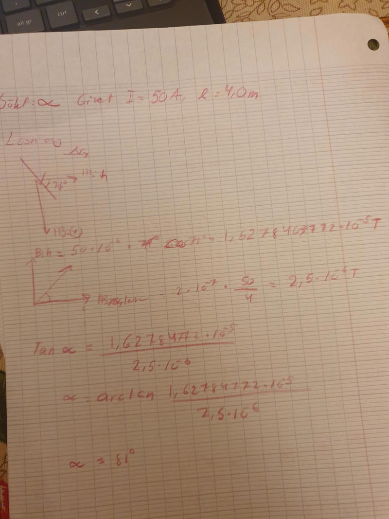 Ok, B-fältet från ledaren går åt öster. Horisontalkomposanten av jordmagnetiska fältet går åt norr. Kompassen borde peka i resultantens riktning.