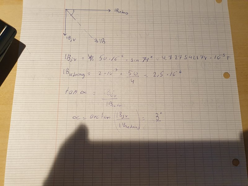 Du ska räkna ut vinkeln mellan resultanten och Bjh (eftersom kompassen ställer normalt in sig efter Bjh, så blir denna vinkel avvikelsen).