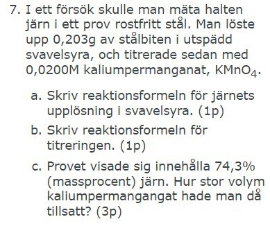 Första steget är att fundera på vad det blir av järnet när man löser upp det i svavelsyra. Det ska bli till något som kan oxideras ett steg till av permanganatet.