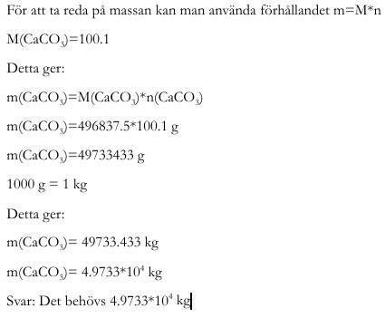 Varifrån får du att mängden kalciumkarbonat är 496 837,5 mol? Jag httar inte den uträkningen.