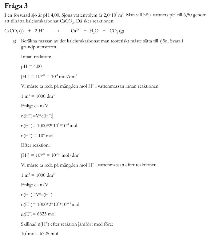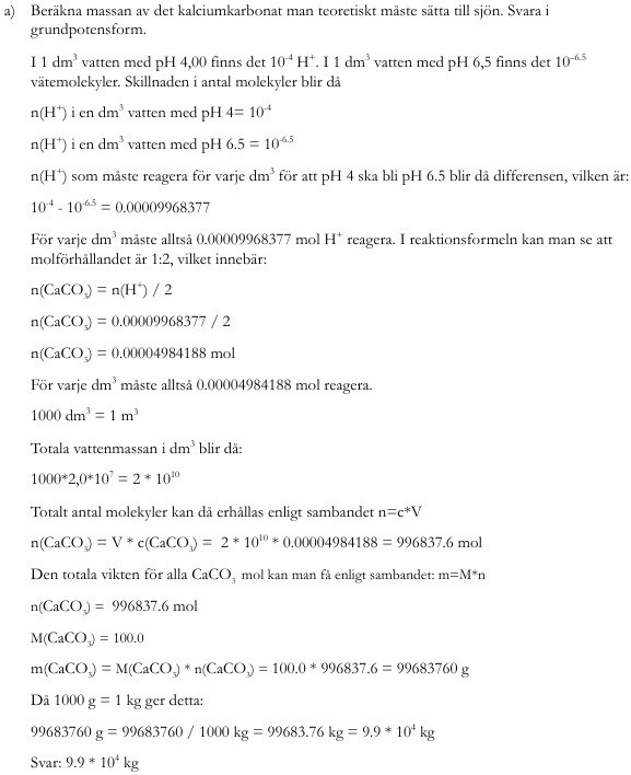 I 1 liter vatten med pH = 4,00 finns det 10-4 = 0,000 1 mol oxoniumjoner. I 1 liter vatten med pH = 6,50 finns det 10-6,5 = 0,000 000 3 mol oxoniumjoner. Det betyder att 0,0001 mol oxoniumjoner behöver förbrukas. Det går åt 0,5 mol karbonatjoner för varje mol oxoniumjoner, så det kommer att gå åt 0,000 05 mol kalciumkarbonat för att neutralisera 1 liter sjövatten. Detta motsvarar 0,005 g kalcium per liter vatten, eller 5 g/m3.