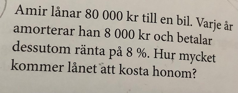 Jag testade att skriva upp ekvationen (80000-8000n)0,08 för att få att det kommer ta 10 år och sedan använde jag summaregeln för en geometrisk talföljd men fick fel.