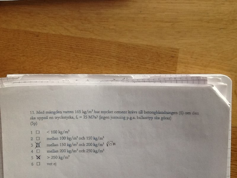 hej i liknande uppgift Dvs 11)Med mängden vatten 165kg/m^3 hur mycket cement krävs till betongblandningen om den ska uppnå en tryckstyrka f=25 Mpa