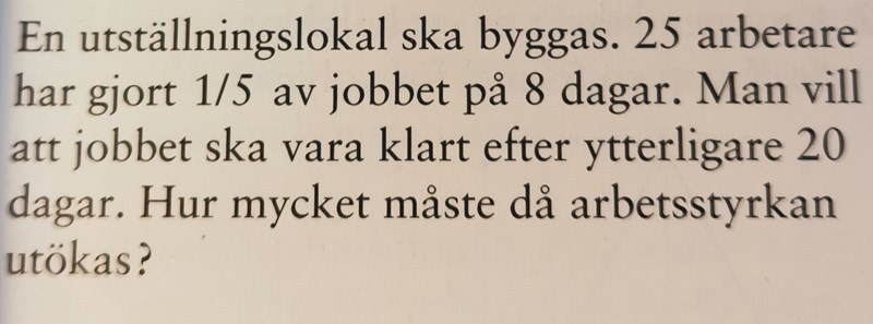 Fatime G skrev:Hur länge tid skulle 25 arbetare bygga hel jobb om de gjort 1/5 av jobbet på 8 dagar?