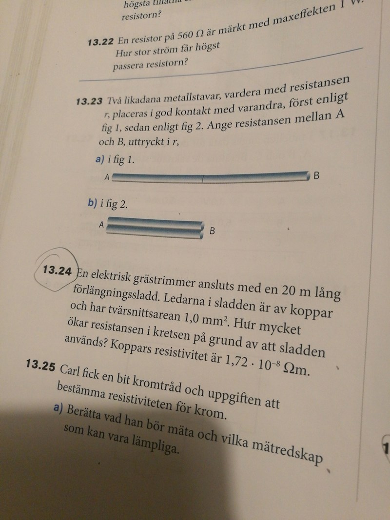 Hej uppgift 13.24. Jag vet ej varför facit säger 0,69 ohm. Jag får 34 ohm. Såhär gjorde jag