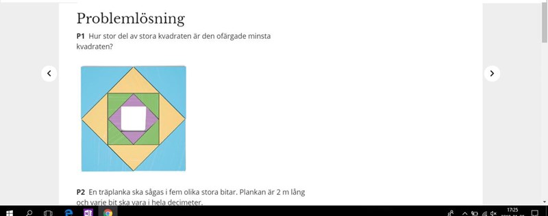 Jag räknade så här typ... Jag såg 4 mellanrum och jag skissade snabbt den här den blåa kvadraten med den beigea. Jag tog den beigea kvadraten och dividerade den lika stort som mellanrummen mellan den beigea och den blåa .Jag räknade mellanrummen och hur mycket bitar jag delade den beigea kvadraten , så då blev det 4/6 jag förkortade den, 2/3?