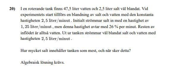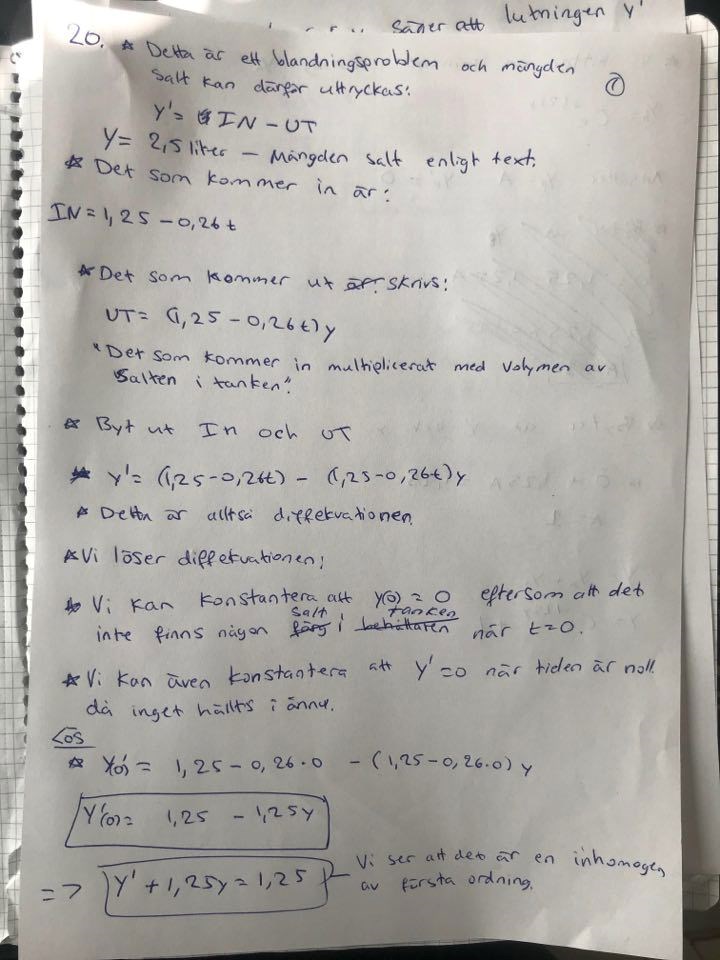 Jag har kommit fram till att y'+ 1,25= 1,25. Vet inte hur jag ska lösa diffekv. för att kunna hitta funktionen som beskriver hur mycket salt det är i tanken. Som jag också sedan kan använda för att hitta extrempunkten, men hur ska man hitta extrempunkten? Vet lixom vad jag ska göra med inte hur.