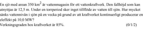 mag1 skrev:Fast du borde nog räkna ut hur mycket vatten per sekund det krävs för att generera 10 MW. Kanske kan du börja med att räkna ut hur stor massa vatten som kan lyftas 12,5 meter upp med 10 MJ energi (d.v.s. 10 MW per sekund). Då vet du hur mycket vatten som krävs för att generera 10MW, vid 100% effektivitet (sedan är effektiviteten 85% i uppgiftens kraftverk). Och denna energi genereras under en veckas tid.