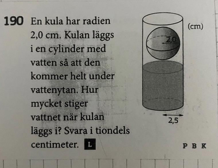 beräkna kulans volym och sen hur hög en cylinder med samma radie ska var för att få samma volym