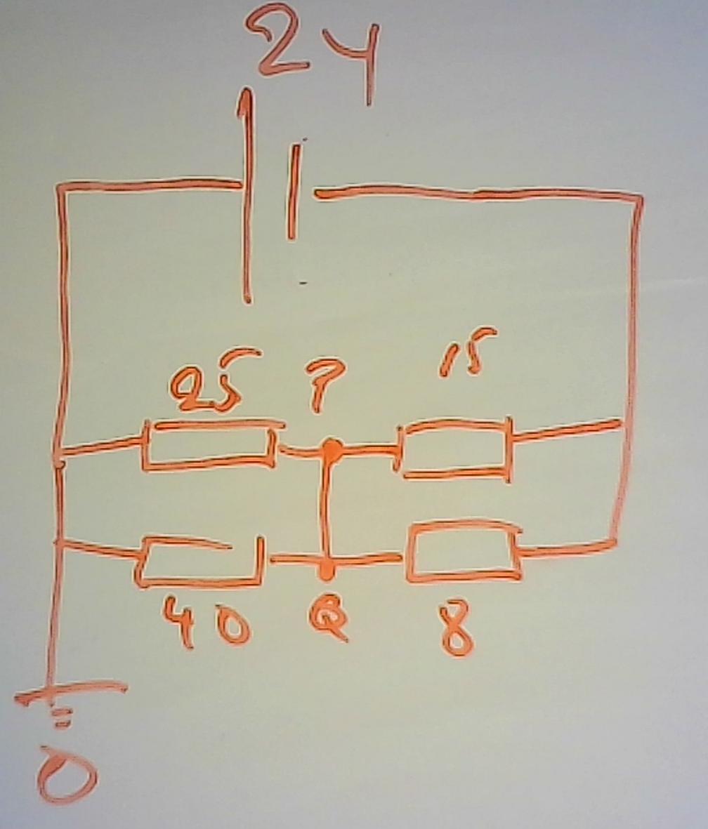 Den strömmen går genom de två motstånden 25 parallellt med 40, hur stor blir spänningen över dom?