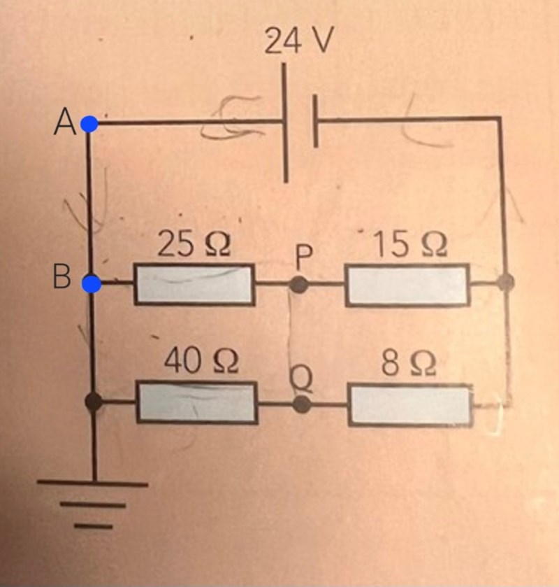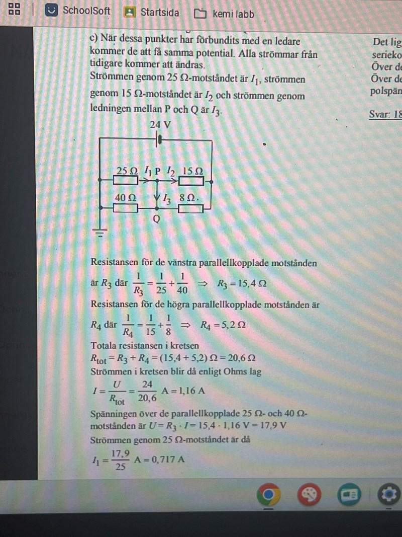 Jag förstår inte heller varför strömmen genom 25 ohms-resistorn skulle vara lika mycket som den ström som flödar mellan P och Q, vilket stod i facit. Men en del av strömmen som går genom 25 ohms-resistorn också går genom 15 ohms-resistorn, så det borde inte vara samma som strömmen som flöder genom 25 ohm resistorn eller.