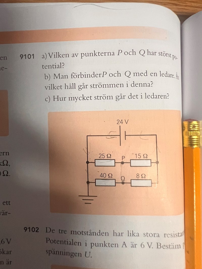 Jag har fastnat på uppgift 9101 c). Jag förstår att potentialskillnaden blir 0 mellan P och Q, och jag förstår att trots att spänningen är 0, måste strömmen gå igenom P och Q för att kunna anpassa sig till resistorerna. Men det jag inte förstår är hur vi vet att strömmen kommer att gå just från P till Q, eftersom de har samma potential. I början trodde jag att strömmen flödade från P till Q för att potentialen i P var högre, men nu Ãr ju potentialen samma vid både P och Q