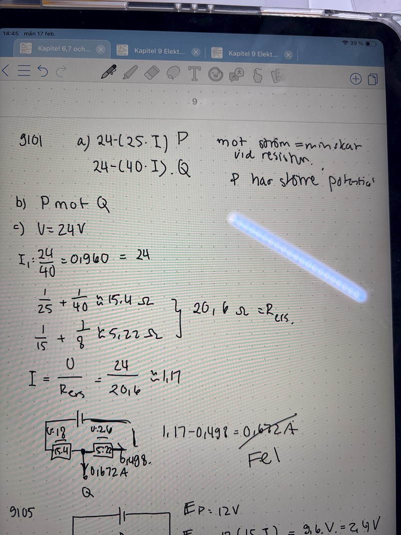 (Men dit sätt att räkna ut svaret på a) var inte rätt. Om man vill slippa räkna ut strömmen kan man använda spänningsdelning och räkna )