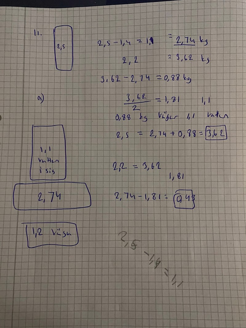 Skillnaden i vätskevolym är då 2,2 l - 1,4 l = 0,8 l0,8 liter mer vätska ger alltså en viktökning på 0,88 kg.