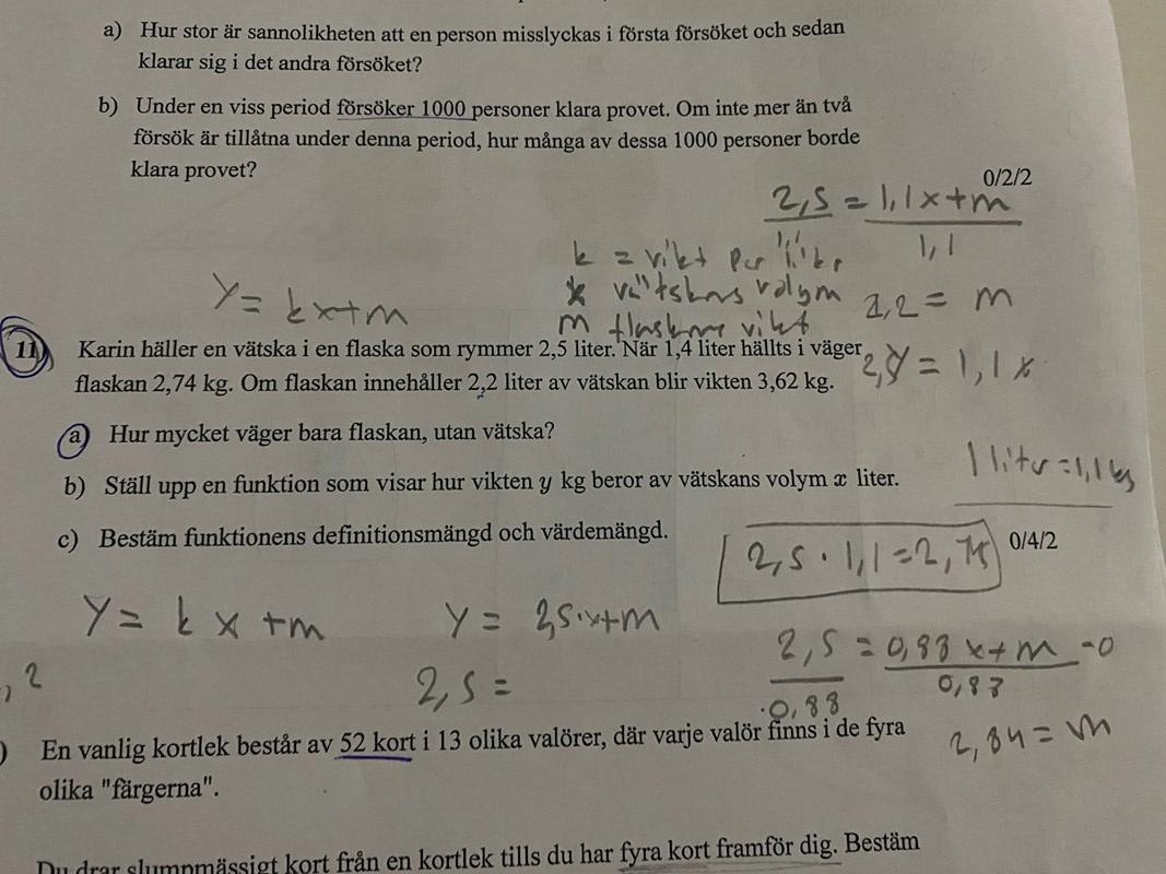 Mogens skrev:Vikten är y = kx+m där m är flaskans vikt, x är vätskans volym och k är vikt per liter.