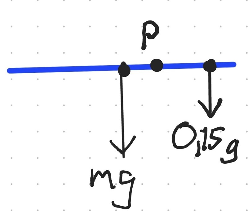 Man lägger en 1-meterslinjal på ett bord och ställer en 150 g-vikt på linjalen på avståndet 16 cm från dess ena ände. Man skjuter sedan ut linjalen över kanten tills den precis balanserar på bordets hörn. Då har linjalen skjutits ut 41 cm över kanten. Hur mycket väger linjalen?