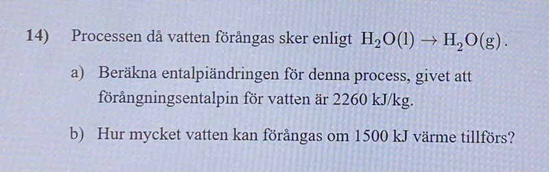 Hej! Löste A-uppgiften genom att räkna ut substansmängden för 1 kilo vatten och sedan dividera substansmängden med 2260 kJ och fick då 40,7 kJ vilket är rätt. Men B-uppgiften förstår jag inte hur man löser. Är också osäker på om det är q (energiförändring) som är 1500 kJ eller ”delta-H” (entalpiförändringen)?