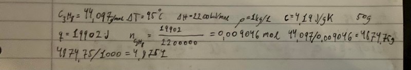 Jag får alltså svaret till 4.87L men de vill att svaret ska bli 6.27L. är det mitt q som är fel? har räknat det såhär: q=m*c*deltaT=50[g]*4.19[J/g*K]*95. Eller är det något annat jag missar? Såhär lyder uppgiften: Du har en gasbehållare med 50 g propan (C3H8) till ditt gaskök. Hur mycket vatten från den närbelägna fjällbäcken med en temperatur på 5°C kan du värma upp till 100°C för att laga mat?