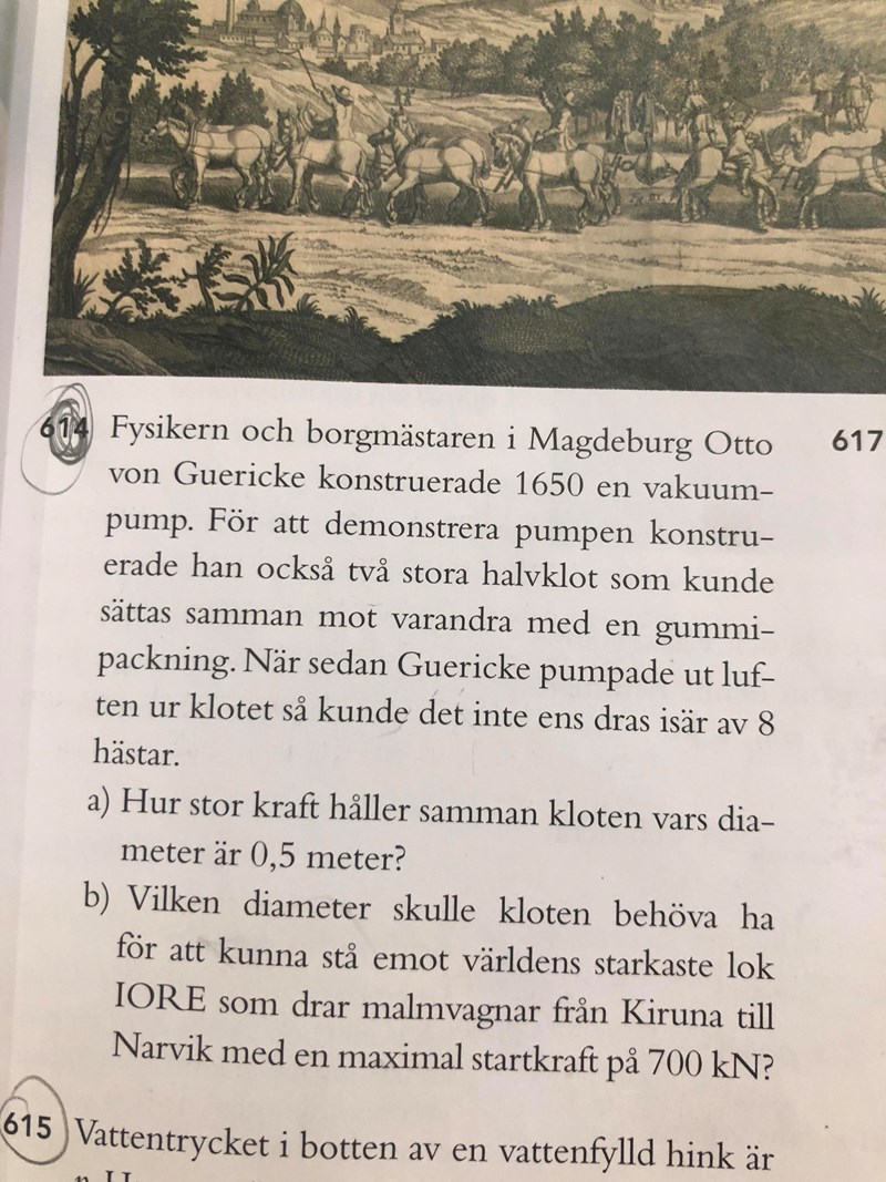 har svårt att förstå hur jag ska lösa uppgift 614 a. Jag vet inte hur man kan rita en bild som illustrerar pumpen som fysikern i uppgiften skapade..Det jag lyckades förstå är att trycket i den ena halvklotet är lika stor som trycket i det andra halvklotet