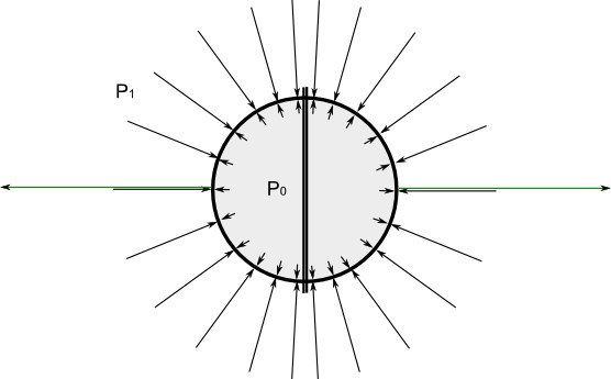 De långa pilarna utanför klotet är trycket P1 utifrån som verkar med krafter vinkelrätt mot ytan. Det finns motsvarande krafter inifrån men de försummar vi.