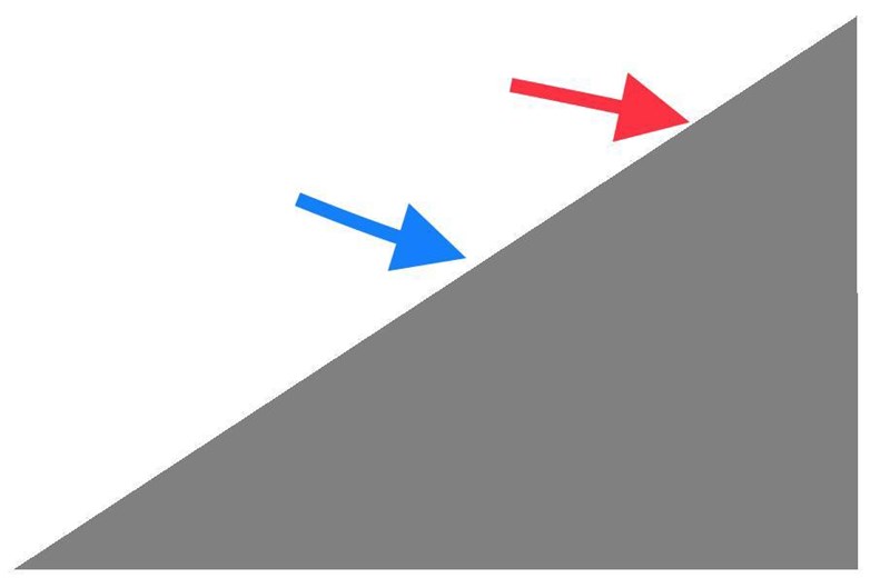 Föremålet som startar vid den röda pilen har från start mer lägesenergi än det som startar vid den blåa pilen. Därför kommer det att få större rörelseenergi och därmed uppnå högre hastighet än det föremål som startar vid den blåa pilen.