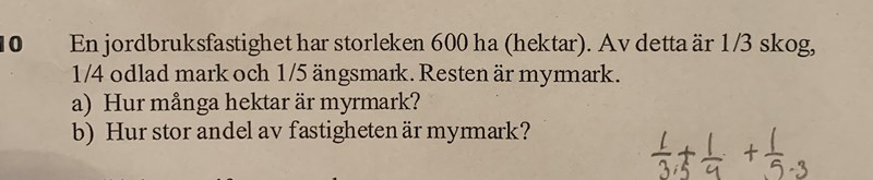 tack för ditt svar, men undrar bara hur du räkna ut att 1/3 är 200 ha, 1/4 är 150 ha osv